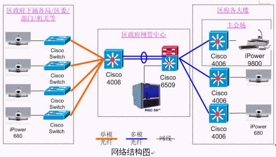 9800,分會(huì)場(chǎng)使用iPower 680。網(wǎng)管中心安放一臺(tái)Polycom 公司的MGC-50(多點(diǎn)會(huì)議控制單元),用于對(duì)全網(wǎng)終端的控制,實(shí)現(xiàn)多點(diǎn)間、點(diǎn)對(duì)點(diǎn)會(huì)議。各視頻設(shè)備通過網(wǎng)線連接在各主要交換機(jī)上。