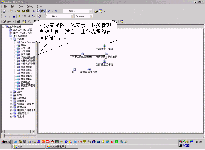 該產(chǎn)品通過將所有業(yè)務(wù)分別處于樹形化的節(jié)點(diǎn)上,可以直觀的對(duì)業(yè)務(wù)進(jìn)行增加、刪除、修改的管理。增加子業(yè)務(wù)的時(shí)候,必須帶有業(yè)務(wù)類別,實(shí)現(xiàn)業(yè)務(wù)管理歸類化,避免業(yè)務(wù)管理的混亂。該產(chǎn)品還支持業(yè)務(wù)流程的樹形化表示,使業(yè)務(wù)流程開發(fā)者可以方便地了解業(yè)務(wù)流程的全局框架。