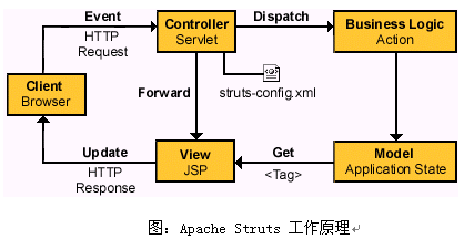 WebGrid CRM在技術(shù)實(shí)現(xiàn)上采用Sun公司的標(biāo)準(zhǔn)的MVC(Model-View-Controller)三層體系進(jìn)行架構(gòu),主要通過在Apache公司開發(fā)的Struts Framework的基礎(chǔ)上進(jìn)行應(yīng)用擴(kuò)展,參見下圖結(jié)構(gòu):