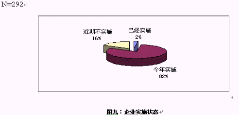 對(duì)大多數(shù)企業(yè)來說,對(duì)CRM還處于關(guān)注階段,只有7家企業(yè)表示已經(jīng)開始實(shí)施,在電話訪問中,了解到這7家企業(yè)的實(shí)施的主要是在渠道管理和客戶呼叫中心等方面,但表示今年會(huì)開始實(shí)施的卻超過8成。