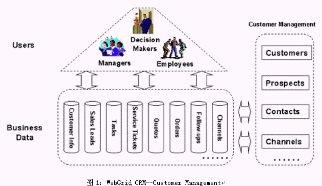 WebGrid CRM是基于CRM理念而設(shè)計(jì)的,它將面向客戶的所有業(yè)務(wù)進(jìn)行整合,提供了統(tǒng)一的業(yè)務(wù)平臺(tái),并使用工作流技術(shù)將各種業(yè)務(wù)緊密聯(lián)系起來。WebGrid CRM 的功能可以歸納為三個(gè)方面:1) 對(duì)銷售、營銷和客戶服務(wù)三部分業(yè)務(wù)流程的信息化;2) 與客戶進(jìn)行溝通所需要的手段(如電話、傳真、網(wǎng)絡(luò)、Email等)的集成和自動(dòng)化處理;3) 對(duì)上面兩部分功能所積累下的信息進(jìn)行的加工處理,產(chǎn)生客戶智能,為企業(yè)的戰(zhàn)略戰(zhàn)術(shù)的決策作支持。見下圖所示:
