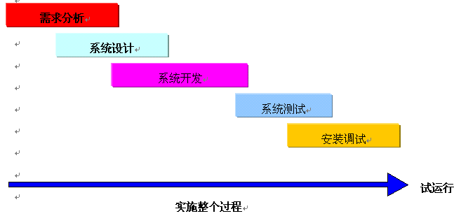 系統(tǒng)實(shí)施分階段進(jìn)行,大致分為需求分析、系統(tǒng)設(shè)計、系統(tǒng)開發(fā)、系統(tǒng)測試、安裝調(diào)試、試運(yùn)行及驗(yàn)收。實(shí)施的具體時間表應(yīng)有雙方單位根據(jù)實(shí)際情況商議確定。