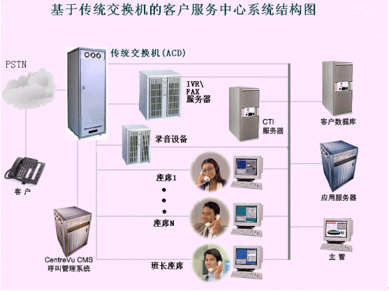 在以往大型CTI系統(tǒng)的設(shè)計中,這種模式是最常用的解決方案。傳統(tǒng)交換機由于其電信級標(biāo)準(zhǔn)的設(shè)計,接入容量大、交換處理能力強、性能穩(wěn)定,因而往往被大、中型呼叫中心用在前端構(gòu)成ACD系統(tǒng)(自動呼叫分配系統(tǒng))用來處理排隊、路由管理、坐席管理等功能。