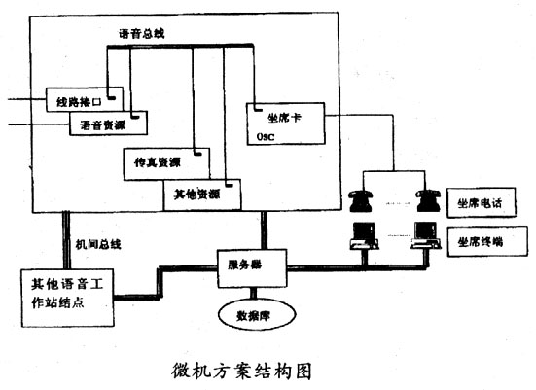 這種方案以近幾年發(fā)展迅速的微機(jī)語音處理技術(shù)為基礎(chǔ),其基本思想是在微機(jī)平臺上集成各種功能的語音處理卡,完成通信接口、語音處理、傳真處理、坐席轉(zhuǎn)接等功能,再結(jié)合外部的計(jì)算機(jī)網(wǎng)絡(luò)實(shí)現(xiàn)各種應(yīng)用系統(tǒng)的需求。