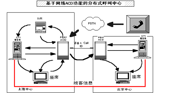 采用智能呼叫分配(ACD),由多種條件決定路由的選擇,如業(yè)務(wù)員的忙閑統(tǒng)計(jì)、業(yè)務(wù)員的服務(wù)能力、每天不同時段呼叫統(tǒng)計(jì)、主叫用戶的所在區(qū)域以及主叫用戶的號碼等。企業(yè)呼叫中心甚至可突破語言界限,跨越不同電話系統(tǒng)網(wǎng)絡(luò)分布到全球轉(zhuǎn)發(fā)話音及數(shù)據(jù)。