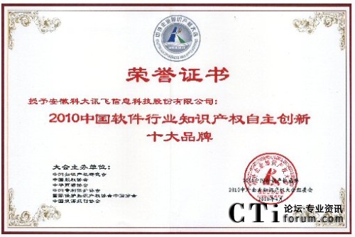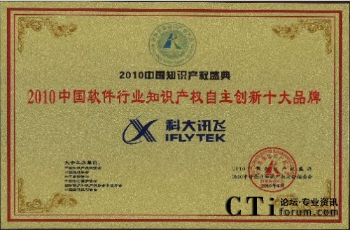 CTI論壇(ctiforum)4月29日消息(記者 潘婷婷):2010年4月25日,由中國知識產(chǎn)權(quán)研究會、中國專利保護(hù)協(xié)會、中國版權(quán)協(xié)會等單位聯(lián)合舉辦的“2010中外企業(yè)知識產(chǎn)權(quán)大會”在人民大會堂隆重舉行。在當(dāng)日的“2010中國知識產(chǎn)權(quán)盛典頒獎典禮”中,科大訊飛憑借強(qiáng)大的自主創(chuàng)新能力以及在知識產(chǎn)權(quán)創(chuàng)造、保護(hù)與應(yīng)用方面的突出表現(xiàn)獲評“2010年中國軟件行業(yè)知識產(chǎn)權(quán)自主創(chuàng)新十大品牌”。