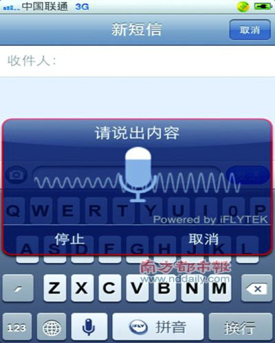 錄入結(jié)束后,點(diǎn)擊“停止”,輸入法會自動開始對剛才錄入的語音進(jìn)行識別。需要注意的是,這個時(shí)候只有通暢的3G網(wǎng)絡(luò)或者W IFI網(wǎng)絡(luò),才能順利識別;如果信號欄顯示“E”或者“O”,都將無法得到正確識別,也無法錄入短信內(nèi)容。