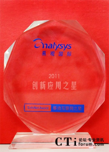 易觀國際成立于2000年,是中國信息化、互聯(lián)網(wǎng)和新媒體以及電信運(yùn)營行業(yè)規(guī)模最大的中國科技市場領(lǐng)先的研究和咨詢機(jī)構(gòu)。2011易觀“EnfoNet Award–移動(dòng)互聯(lián)網(wǎng)之星”評選是易觀年度產(chǎn)業(yè)盛會——首屆移動(dòng)互聯(lián)網(wǎng)博覽會暨第四屆易觀移動(dòng)互聯(lián)網(wǎng)年會的重要組成部分,是易觀國際(Analysys International)為推薦中國互聯(lián)網(wǎng)及移動(dòng)互聯(lián)網(wǎng)產(chǎn)業(yè)中表現(xiàn)優(yōu)異且具備發(fā)展?jié)摿Φ钠脚_及應(yīng)用而設(shè)立。