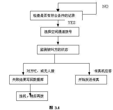 傳真發(fā)送功能是服務(wù)器后臺(tái)操作的,系統(tǒng)定時(shí)檢查傳真發(fā)送庫(kù),一旦有符合條件的記錄,自動(dòng)選擇空閑端口,按設(shè)定的傳真號(hào)碼撥號(hào),檢查被叫方的狀態(tài),若對(duì)方有傳真機(jī)應(yīng)答,則開(kāi)始發(fā)送傳真;若對(duì)方忙、或無(wú)人接,系統(tǒng)稍后會(huì)再次試撥。若超過(guò)設(shè)定次數(shù)仍未發(fā)送成功,系統(tǒng)會(huì)通知發(fā)送人作其它處理。
