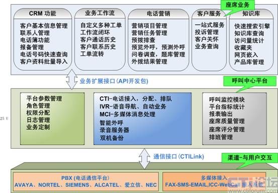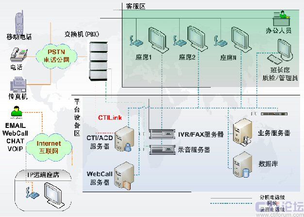 呼叫中心通信平臺,包含了交換機(jī)(PBX)、CTI服務(wù)器、IVR服務(wù)器、傳真服務(wù)器、全程錄音設(shè)備等幾個(gè)部分,是客服中心實(shí)施的基礎(chǔ)。
