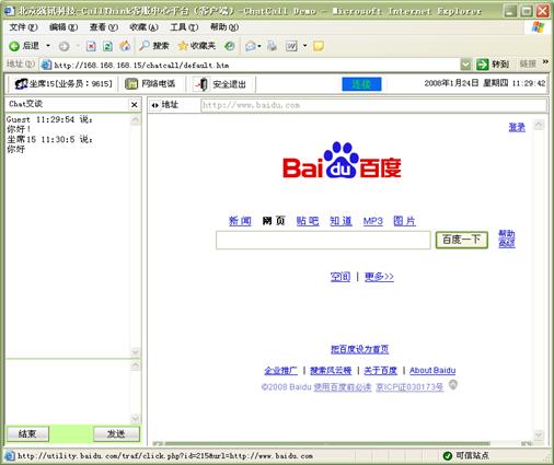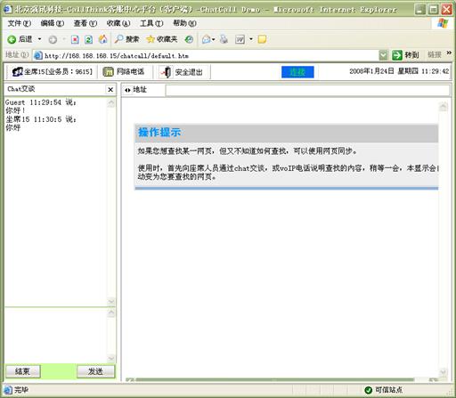Chart交談:客戶可以選擇通過(guò)WEB頁(yè)面與座席通過(guò)文字的形式進(jìn)行交談,無(wú)需語(yǔ)音通信 ,客戶進(jìn)入特定的CHAT網(wǎng)頁(yè)后,可以選擇一個(gè)座席或一組座席進(jìn)行CHAT交談。如圖12和13所示: