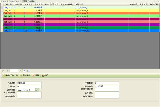 2)自定義工單:根據(jù)所定義的不同類(lèi)型工單,用戶還可以靈活定制每種工單的具體內(nèi)容,并且還可以設(shè)置顯示的顏色,可以更明顯的區(qū)分不同狀態(tài)的工單、顯示顏色等。如圖6和7所示: