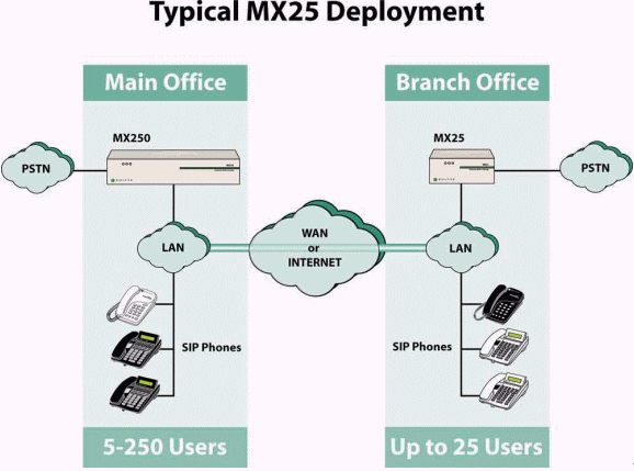 當(dāng)與MX250一起使用時, MX25提供了一種既能將MX250的功能擴展至分支機構(gòu),同時又可確保該分支機構(gòu)與PSTN有效連接的低成本的解決方案。遠程機構(gòu)的工作人員同樣可以使用語音信箱、自動話務(wù)員、在線狀態(tài)和即時消息等功能。如同在總部工作一樣這些遠程機構(gòu)的工作人員可以與企業(yè)內(nèi)部任意其它地點的人員進行溝通,也可以擔(dān)當(dāng)接線員或ACD(自動話務(wù)分配)組成員的工作。