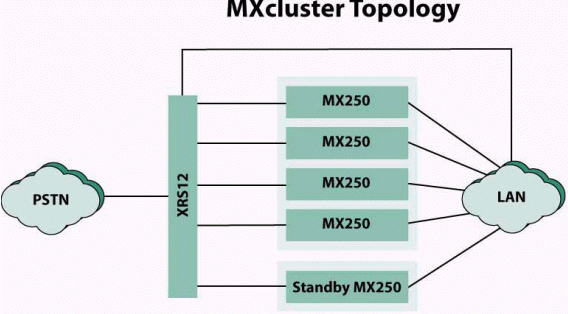 為支持冗余配置蘇迪思科技公司同時(shí)推出新產(chǎn)品XRS12物理連接轉(zhuǎn)換開關(guān)。XRS12可被安裝在19英吋的機(jī)架上,并將占用機(jī)架中的1RU單元。MXcluster集群中每一臺(tái)MX250上的PSTN線路均通過XRS12連接至PSTN網(wǎng)絡(luò)。當(dāng)某一臺(tái)MX250出現(xiàn)故障時(shí),XRS12自動(dòng)將與該臺(tái)MX250對(duì)應(yīng)的PSTN網(wǎng)絡(luò)線路轉(zhuǎn)接至備份MX250上。使用XRS12,無需管理員介入操作,即可實(shí)現(xiàn)MXcluster集群與PSTN的不間斷連接。