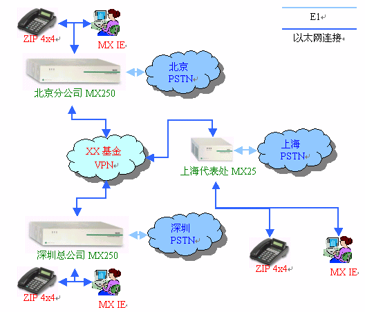 利用現(xiàn)有的VPN網(wǎng)絡(luò)連接深圳總公司和北京分公司的兩臺MX250媒體交換機,上海辦事處配備一臺MX25網(wǎng)關(guān),MX250、MX25與當(dāng)?shù)氐碾娫捑W(wǎng)連接。深圳總公司、北京分公司和上海辦事處配備一定數(shù)量的SIP話機,員工電腦安裝MXIE軟件。