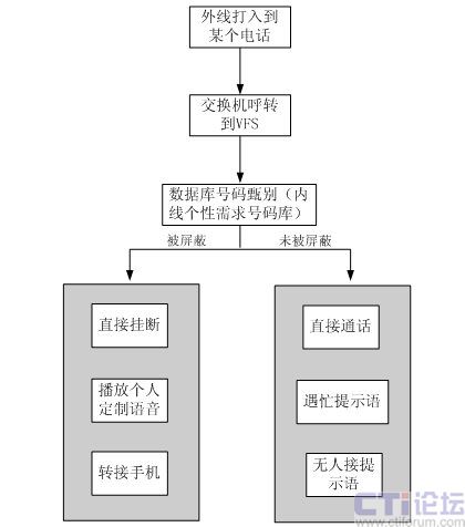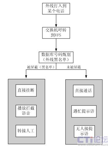 基本技術特點    外線(主叫)撥打某一電話(被叫),在經(jīng)過VFS系統(tǒng)數(shù)據(jù)庫甄別后,如果該外線(主叫)存在于主叫屏蔽號碼段的黑名單數(shù)據(jù)庫中,該外線(主叫)將會被系統(tǒng)自動屏蔽。如被屏蔽,則根據(jù)流程動作,可以播放提示音、轉接人工或者直接掛斷。
