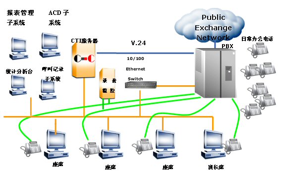 系統(tǒng)采用Siemens Hipath 3750交換機,通過該型號交換機所具有的CTILink接口,向用戶提供了完整的呼叫控制功能,能夠滿足呼叫中心所應有的電話控制的需求;同時提供ACD(自動呼叫分配)功能,實現(xiàn)有效的分配話務。