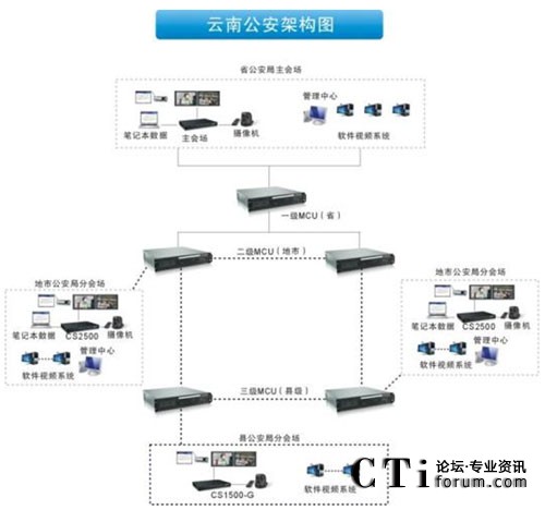 云南省公安廳視頻系統(tǒng)全網(wǎng)建設(shè)結(jié)構(gòu)分為三級(jí):共有146臺(tái)MCU,使用的是省廳—地州、市—縣級(jí)的3級(jí)樹(shù)狀級(jí)聯(lián)模式組網(wǎng)。整個(gè)項(xiàng)目遍布整個(gè)云南省公安系統(tǒng),項(xiàng)目實(shí)施至16個(gè)地州市、129個(gè)縣以及各縣轄區(qū)所有的派出所、戒毒所、看守所。會(huì)場(chǎng)數(shù)目前約有2200個(gè),還在陸續(xù)增加中。同時(shí)支持調(diào)用縣級(jí)公安局指揮中心監(jiān)控視頻編碼器的實(shí)時(shí)監(jiān)控圖像。
