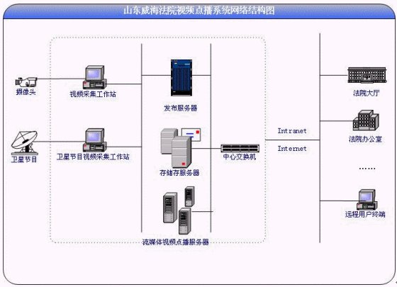 威海中級人民法院VOD應用建設包括:用戶認證系統、遠程上傳系統、內容分發(fā)系統、內容播放系統(流媒體)、網站內容系統等部分。