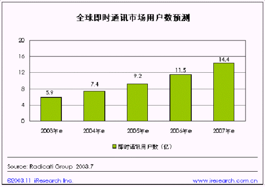 年即時(shí)通訊將成為互聯(lián)網(wǎng)上最普及的交流方式。隨著即時(shí)通訊的普及,全球即時(shí)通訊用戶規(guī)模也在不斷擴(kuò)大。即時(shí)通訊市場(chǎng)龐大的用戶規(guī)模和增長(zhǎng)潛力早已引起了業(yè)內(nèi)巨頭的激烈競(jìng)爭(zhēng)。以美國(guó)為例,目前,AOL、MSN