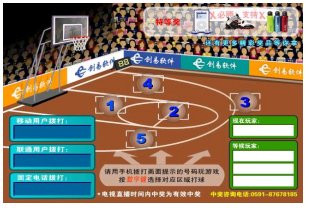 場地分成 5 個(gè)區(qū)域,分別對應(yīng) 1 - 5 ,想在哪個(gè)區(qū)域投籃就按電話機(jī)上對應(yīng)的 1-5 號鍵或直接在手機(jī)上寫短信區(qū)域號( 1-5 )發(fā)送到短信號碼,即可完成一次進(jìn)攻,投中后即可可獲得獎(jiǎng)品。本游戲由電視臺(tái)、網(wǎng)站與電信運(yùn)營商聯(lián)合經(jīng)營的電信增值業(yè)務(wù),由電視臺(tái)提供頻道向電視觀眾播出游戲畫面(含圖像和聲音),電信運(yùn)營商提供電話線路和短信通道,參與者通過固定電話、小靈通和手機(jī)參與游戲,運(yùn)營方通過收取固定電話、小靈通和手機(jī)的信息費(fèi)實(shí)現(xiàn)盈利。