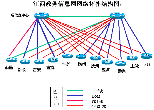 江西省于2002年8月開(kāi)始實(shí)施省政務(wù)信息網(wǎng)縱向網(wǎng)省市聯(lián)網(wǎng)工程,于2002年12月底實(shí)施完畢。目前,在南昌地區(qū)已建成省級(jí)政務(wù)核心網(wǎng)及政務(wù)專(zhuān)網(wǎng),省委、省政府、省人大、省政協(xié)及一百多個(gè)省直部門(mén),已通過(guò)光纜實(shí)現(xiàn)了橫向網(wǎng)絡(luò)互聯(lián)。