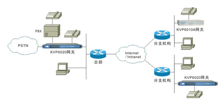 KVP6020采用模塊化設(shè)計(jì),支持FXS、FXO、E&M、E1等多種語(yǔ)音模塊,最大可支持40路FXS用戶接口,可用于總部和大、中型分支機(jī)構(gòu),提供IP語(yǔ)音通信業(yè)務(wù),也可通過(guò)FXO、E&M、E1等中繼接口與PBX、與PSTN相連,提供中繼匯接業(yè)務(wù),典型應(yīng)用如下圖。