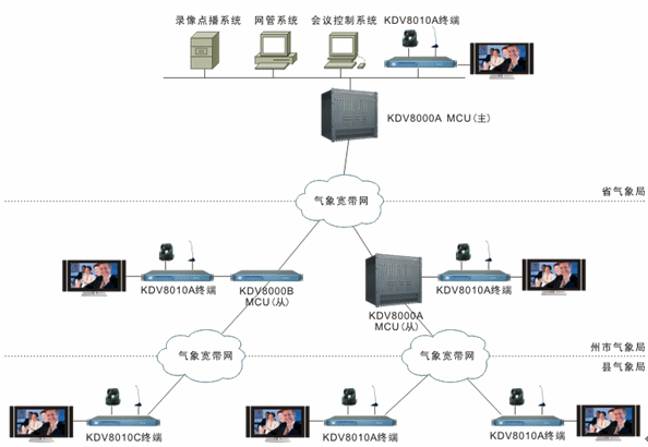 目前,一期工程已完成省到地市的建設(shè),系統(tǒng)設(shè)備全部基于科達(dá)KDV系列視頻會(huì)議產(chǎn)品。省氣象局部署KDV8000A多點(diǎn)控制單元1套,負(fù)責(zé)整個(gè)視訊網(wǎng)絡(luò)的交換和管理;省氣象局預(yù)報(bào)會(huì)商室與各州市氣象局預(yù)報(bào)會(huì)商室各部署KDV8010A高清視頻會(huì)議終端1臺(tái),提供本地會(huì)場視音頻信號(hào)的接入。州市氣象局的視頻會(huì)議終端通過氣象寬帶網(wǎng)接入省氣象局的多點(diǎn)控制單元。其中,KDV8010A支持H.239雙視頻流功能,可同時(shí)接入會(huì)議攝像機(jī)和電腦VGA信號(hào),并可同時(shí)輸出視頻信號(hào)和VGA信號(hào)到電視機(jī)和投影儀,實(shí)現(xiàn)與會(huì)者圖像和輔助視頻圖像的同時(shí)傳輸。
