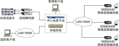 KDM2440/2440P可作為網(wǎng)絡(luò)視頻監(jiān)控系統(tǒng)的智能化前端接入單元,與攝像機一起實現(xiàn)監(jiān)控點的集成化部署,攝像機采集的模擬視頻信號經(jīng)編碼處理后以IP碼流形式上傳至中心業(yè)務(wù)平臺,在監(jiān)控客戶端的管理和控制下,中心業(yè)務(wù)平臺將上傳的碼流按需轉(zhuǎn)發(fā)到監(jiān)控客戶端、視頻解碼器以及網(wǎng)絡(luò)錄像單元,分別實現(xiàn)PC瀏覽、電視墻顯示以及錄像存儲。