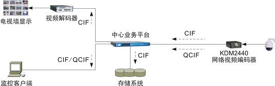 KDM2440/2440P集成了雙碼流功能,可對單路模擬視頻進行CIF和QCIF兩種格式的同時編碼上傳,并由中心業(yè)務(wù)平臺進行差異化轉(zhuǎn)發(fā)。比如,視頻解碼器和錄像存儲單元接收CIF視頻,可實現(xiàn)較高清晰度的圖像顯示和存儲,而客戶端接收QCIF視頻,可有效降低PC資源的消耗,從而保證客戶端在進行多畫面視頻實時瀏覽時的應(yīng)用效果。
