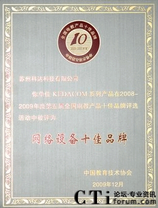 CTI論壇(ctiforum)12月14日消息(記者 張塵):2009年12月4日,由國內(nèi)教育權(quán)威機構(gòu)“中國教育技術(shù)協(xié)會”主辦,以讀者調(diào)查問卷的形式舉行的第五屆全國電教產(chǎn)品十佳品牌頒獎典禮在福州梅峰賓館盛大開幕,科達教育視頻會議產(chǎn)品憑借卓越的產(chǎn)品性能和良好的客戶服務入選網(wǎng)絡產(chǎn)品類十佳之列,同時也成為首個入選十佳品牌的視頻會議產(chǎn)品。