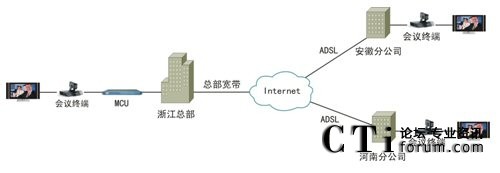 該套視頻會(huì)議系統(tǒng)最大的特點(diǎn)就是擁有超強(qiáng)的網(wǎng)絡(luò)適應(yīng)性。由于采用了高效視音頻編碼技術(shù)和大量智能化網(wǎng)絡(luò)適應(yīng)技術(shù),無論是ADSL、光纖還是VPN,均可進(jìn)行快速接入,并充分保證在Internet環(huán)境下的會(huì)議效果。因此,天元置業(yè)此次視頻會(huì)議系統(tǒng)就是完全基于公司現(xiàn)有的Internet進(jìn)行部署的。如圖1。