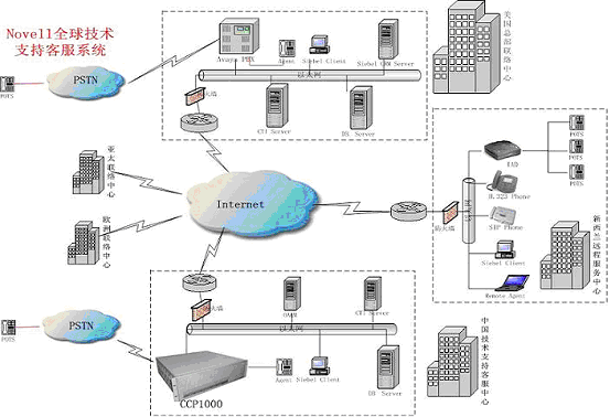 Novell中國(guó)技術(shù)支持中心采用融天科技的RT-CCP1000作為呼叫處理平臺(tái),業(yè)務(wù)處理通過Internet用瀏覽器的方式使用美國(guó)現(xiàn)有的Siebel CRM業(yè)務(wù)系統(tǒng),作為Novell全球客戶服務(wù)支撐體系的一個(gè)分支,響應(yīng)來(lái)自全球的客戶服務(wù)。基于IP網(wǎng)絡(luò),系統(tǒng)設(shè)立了遠(yuǎn)端座席,為不同地區(qū)的用戶提供本地化、無(wú)差異化的服務(wù)。