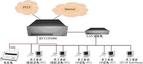 1. 用單個(gè)RT-CCP1000取代原有系統(tǒng)的傳統(tǒng)PBX和代理服務(wù)器,提供電話系統(tǒng)功能和Internet接入。
