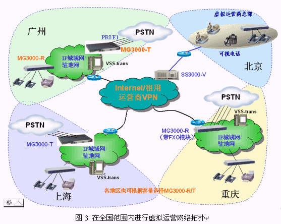 對于想在全國范圍內(nèi)運營的虛擬運營商,在總部放置一套SS3000-V,同時在有用戶群的區(qū)域的用戶網(wǎng)內(nèi)放置VSS-trans,以解決公網(wǎng)-私網(wǎng)及私網(wǎng)-私網(wǎng)之間的NAT/PAT穿越。為了解決長途問題,在各地放置MG3000-T實現(xiàn)長途落地。為了保證語音質(zhì)量,通常虛擬運營商通過自己的IP網(wǎng)或租用VPN等,沒有相關(guān)資源時也可以通過Internet將各地聯(lián)系起來,通過在各分部放置FXO口IAD或MG3000-T可以實現(xiàn)長途零話費,利用各地網(wǎng)關(guān)相互落地,從而實現(xiàn)撥叫其他區(qū)域的外網(wǎng)用戶只需付市話費。這樣就為虛擬運營提供了很好的競爭基礎(chǔ),開拓了廣闊的利潤空間。