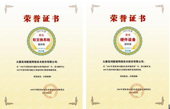 日前,由C114中國通信網(wǎng)主辦的“2007年度優(yōu)秀IP通信企業(yè)評選活動”圓滿結(jié)束。大唐高鴻數(shù)據(jù)網(wǎng)絡(luò)技術(shù)股份有限公司(以下簡稱“大唐高鴻”)憑借雄厚實(shí)力喜獲“2007年度中國IP通信行業(yè)最佳軟交換系統(tǒng)提供商”和“2007年度中國IP通信行業(yè)最佳硬件設(shè)備提供商”兩項大獎。這是大唐高鴻繼2007年4月榮獲中國VoIP論壇“2006年最佳中繼網(wǎng)關(guān)提供商”和“2006最佳VoIP解決方案提供商”兩項大獎之后的又一次實(shí)至名歸。