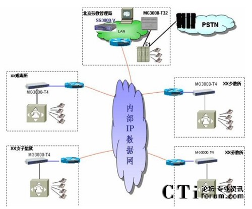 下面14個監(jiān)獄都有PBX程控交換系統(tǒng),各PBX程控交換機都可提供E1中繼板卡,采用大唐高鴻的MG3000-T4數(shù)字中繼網關和其對接,很方便就實現(xiàn)下面各監(jiān)獄的原來電話網的IP化融合改造,且對各監(jiān)獄原有的PBX程控交換機使用習慣上都不做任何改變。