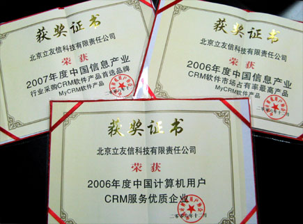 2007年1月16日,中國計(jì)算機(jī)用戶協(xié)會(huì)在京召開隆重而盛大的年度頒獎(jiǎng)儀式。MyCRM在本次會(huì)上榮獲殊榮,一舉囊括了“2006年度中國信息產(chǎn)業(yè)CRM 軟件市場占有率最高產(chǎn)品”,“ 2006年度中國計(jì)算機(jī)用戶CRM服務(wù)優(yōu)質(zhì)企業(yè)”和“2007 年度中國信息產(chǎn)業(yè)行業(yè)采購CRM軟件產(chǎn)品首選品牌”。本次獲獎(jiǎng)充分體現(xiàn)了MyCRM在CRM市場的全面領(lǐng)先優(yōu)勢。