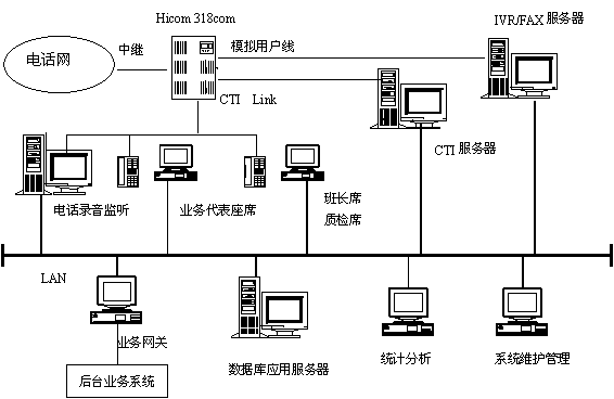 主要包括:Siemens Hicom 318com交換機(jī)、CTI服務(wù)器、IVR/FAX服務(wù)器、業(yè)務(wù)代表座席、班長(zhǎng)和質(zhì)檢座席、電話錄音監(jiān)聽系統(tǒng)、數(shù)據(jù)庫(kù)應(yīng)用服務(wù)器、統(tǒng)計(jì)分析工作站、系統(tǒng)維護(hù)管理工作站、業(yè)務(wù)網(wǎng)關(guān)、網(wǎng)絡(luò)系統(tǒng),其邏輯結(jié)構(gòu)下圖所示。