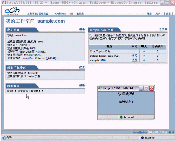 上圖是eQueue坐席員的標(biāo)準(zhǔn)工作界面,其中左側(cè)包含的信息有:坐席員個人資料、隸屬的坐席組、工作狀態(tài)、可服務(wù)的媒體類型、系統(tǒng)公告;右側(cè)有隊(duì)列中處于等待狀態(tài)的呼叫請求數(shù)量。界面上方設(shè)置有益昂公司特色的知識庫(KB)鏈接,單擊鏈接可以查找到客戶所關(guān)心問題的標(biāo)準(zhǔn)回復(fù)內(nèi)容。在這個界面里,坐席員可以完成包括語音呼叫、電子郵件在內(nèi)的所有工作。