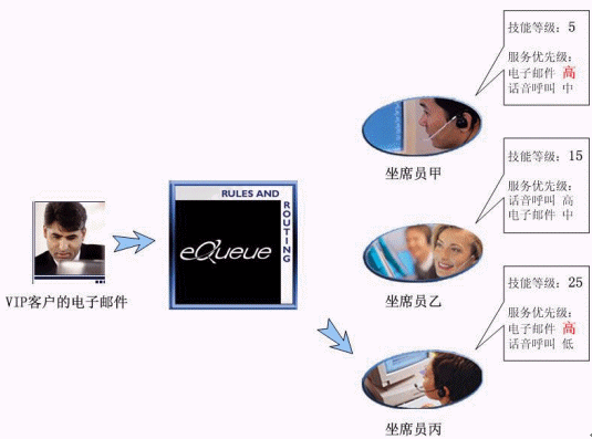 我們假設(shè)在某個聯(lián)絡(luò)中心里,有甲、乙、丙三位坐席員工作在同一個項(xiàng)目組(坐席組)。甲是新員工,只具有基本服務(wù)技能,經(jīng)驗(yàn)很有限;乙是一位擁有豐富經(jīng)驗(yàn)的坐席員,語音呼叫應(yīng)答技巧非常嫻熟,具有回復(fù)電子郵件的技能但是熟練程度略低于語音應(yīng)答技能;丙是一位經(jīng)驗(yàn)豐富、技能全面的坐席員,業(yè)務(wù)熟練,其最擅長的是回復(fù)客戶的電子郵件。假設(shè)有一位重要客戶發(fā)來電子郵件咨詢一個非常專業(yè)的技術(shù)問題。由于這是一位VIP客戶,服務(wù)條款中規(guī)定了他所有的呼叫請求都必須由經(jīng)驗(yàn)豐富的坐席員來響應(yīng)。在eQueue多媒體單一隊(duì)列中,他的電子郵件被限定為坐席員的技能只有達(dá)到或超過等級15才有資格回復(fù)。在3個坐席員中,甲因?yàn)榧寄艿燃壷挥?,不能滿足回復(fù)郵件的先決條件,雖然擁有此項(xiàng)技能且優(yōu)先級為高,依然沒有資格響應(yīng)這個聯(lián)絡(luò)請求;乙、丙的技能等級都滿足回復(fù)郵件的條件,但是丙的此項(xiàng)技能服務(wù)優(yōu)先級為高,因此,在丙坐席員處在可服務(wù)狀態(tài)下,eQueue會將此VIP客戶的電子郵件優(yōu)先派發(fā)給她。只有當(dāng)她處于忙碌狀態(tài)時(shí),才會派發(fā)給乙坐席員。