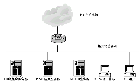 具體系統(tǒng)結(jié)構(gòu)拓?fù)涿枋鋈缦,檔案館公務(wù)網(wǎng)作為上海市公務(wù)網(wǎng)的子網(wǎng),以100Mb/s的速率聯(lián)入上海市公務(wù)網(wǎng),為保證安全可靠,采用加密機(jī)提高安全級(jí)別;整體系統(tǒng)將部署四臺(tái)服務(wù)器: