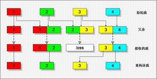在傳輸帶寬允許的情況下,在發(fā)送端對重要的宏塊進行冗余編碼,發(fā)送給對端,這樣的話當網(wǎng)絡(luò)出現(xiàn)異常出現(xiàn)丟包時,可以最大限度保護重要的編碼宏塊不丟失。如下: