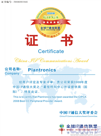 在近日結(jié)束的CIPCA2008年度中國(guó)IP通訊大獎(jiǎng)評(píng)選中,繽特力(Plantronics) 榮獲“最佳呼叫中心外設(shè)提供商(國(guó)際類(lèi))”稱(chēng)號(hào)。