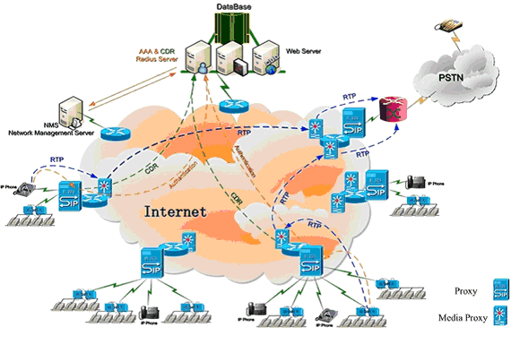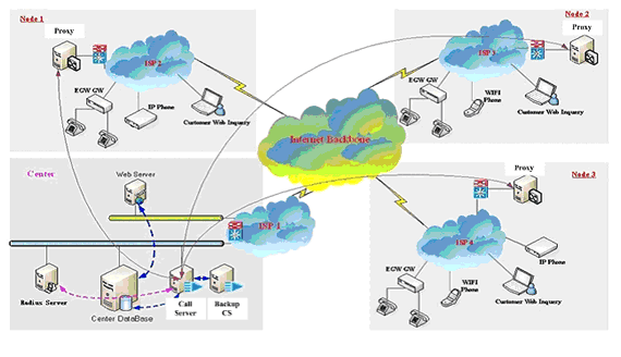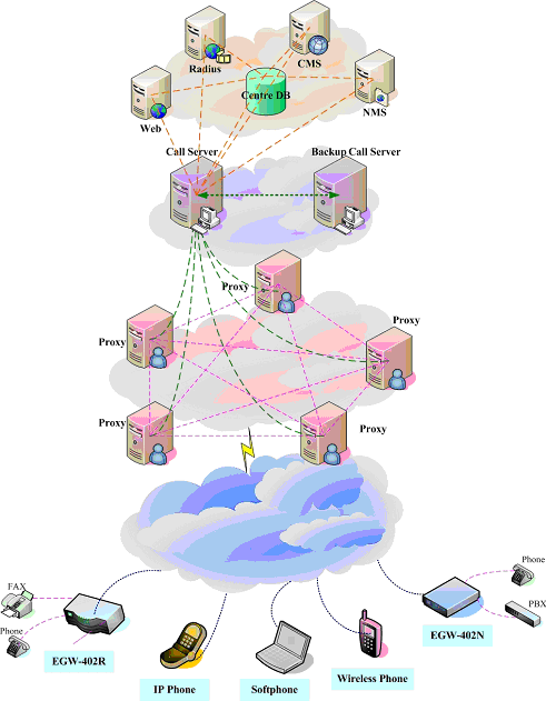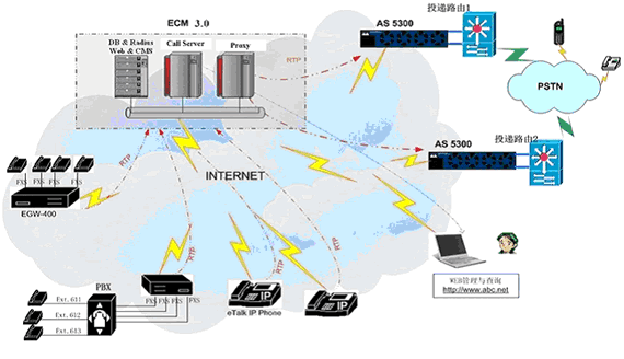 無(wú)論大型企業(yè)用戶(hù)(通過(guò)PBX接入網(wǎng)關(guān)設(shè)備)、小型企業(yè)用戶(hù)(使用網(wǎng)關(guān)設(shè)備)還是其它使用單口網(wǎng)關(guān)或IP Phone的用戶(hù),都可以通過(guò)各種接入方式接入到ECM3.0網(wǎng)絡(luò)中,并通過(guò)PROXY及MEDIA