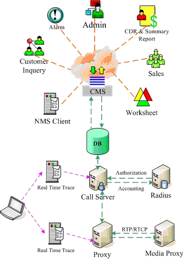 系統(tǒng)管理員通過(guò)Web和CMS對(duì)用戶(hù)進(jìn)行管理,并通過(guò)CS和PROXY所帶的網(wǎng)管功能(NMS)進(jìn)行實(shí)時(shí)的網(wǎng)絡(luò)監(jiān)控及維護(hù),及時(shí)診斷并處理故障。