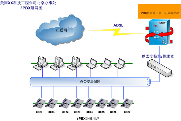 iPBX系統(tǒng)建設(shè)辦公室局域網(wǎng)絡(luò),省去了購買路由器、防火墻等的投入和繁瑣的布線。
