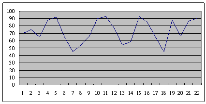 這是另外一個(gè)呼叫中心的服務(wù)水平,也是從早上8點(diǎn)開始,一直到晚上6點(diǎn),每隔半個(gè)小時(shí)的服務(wù)水平趨勢(shì)。雖然平均服務(wù)水平也是在73左右,但震蕩幅度卻小了很多,服務(wù)水平只在81到68這中間震蕩。