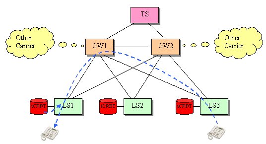 圖5 每個端局交換機配置一套iCRBT系統(tǒng)(有迂回)