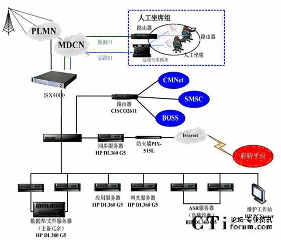 平臺(tái)核心話路接入集在中毅航通信iSX4000智能業(yè)務(wù)交換機(jī)的IVR自動(dòng)語(yǔ)音平臺(tái),人工坐席平臺(tái)通過(guò)和系統(tǒng)支撐軟件實(shí)現(xiàn)遠(yuǎn)端坐席功能,通過(guò)專(zhuān)線中繼與IVR平臺(tái)實(shí)現(xiàn)話路連接;InterNet與IVR平臺(tái)實(shí)現(xiàn)數(shù)據(jù)同步。根據(jù)移動(dòng)交換網(wǎng)傳輸內(nèi)容選擇應(yīng)相的IVR自動(dòng)語(yǔ)音服務(wù)或人工坐席服務(wù)。
